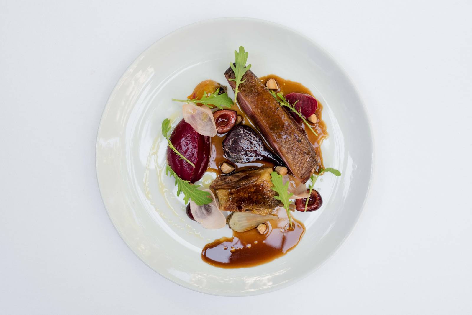 Magret de canard rôti, la cuisse effilochée et le foie gras au vin rouge, poire aux épices, panais confit, jus au porto